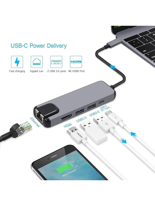 - 5 Multiport USB C Hub: USB-C Power Delivery Charging Port, USB C to HDMI Output,2 x USB 3.0 Ports, Gigabit Ethernet port (RJ45 port) Functional and versatile
