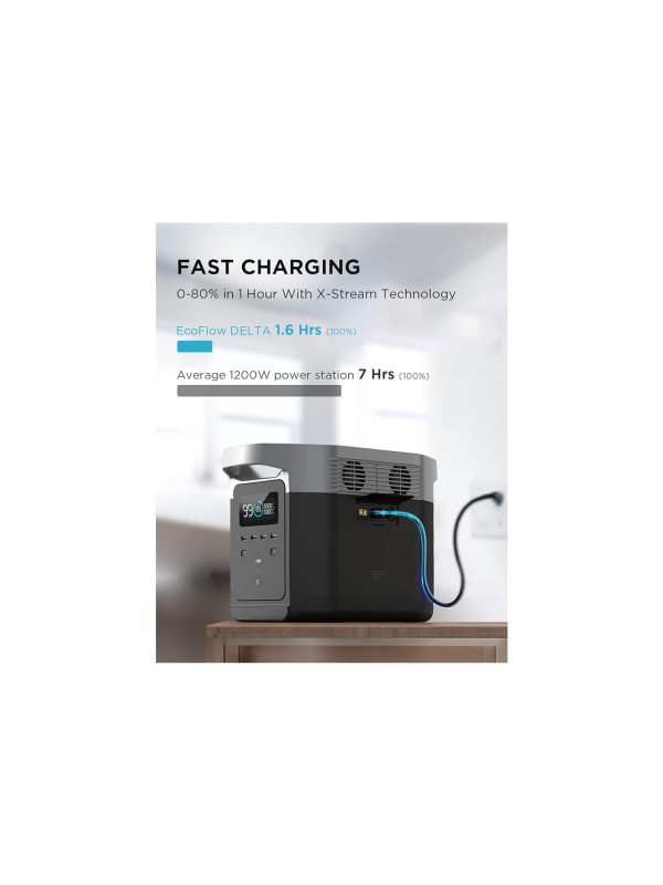 - 0-80% in under 1 Hour. Ecoflow DELTA power station recharged at 10 times the speed of most portable power stations in the market with just a standard AC cable.