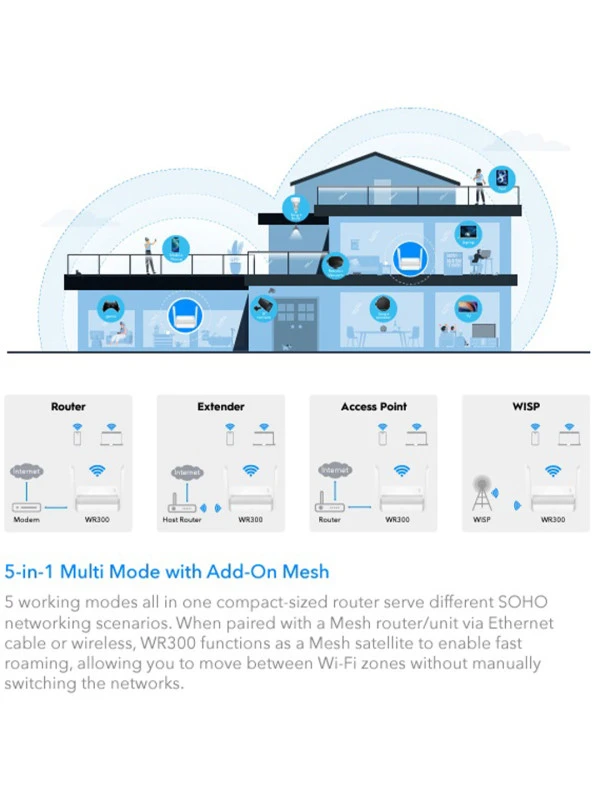 - 5-in-1 Functionality: Works as a Wi-Fi range extender, access point, router, bridge, and repeater.