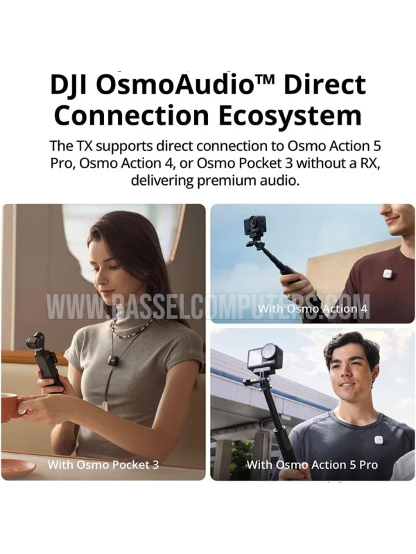- DJI Ecosystem Direct Connection - With DJI OsmoAudio, a transmitter can connect to Osmo Nano, Osmo 360, Osmo Mobile 7P, Osmo Action 6 Pro, Osmo Action 5 Pro, Osmo Action 4, or Osmo Pocket 3 without a receiver, delivering premium audio.