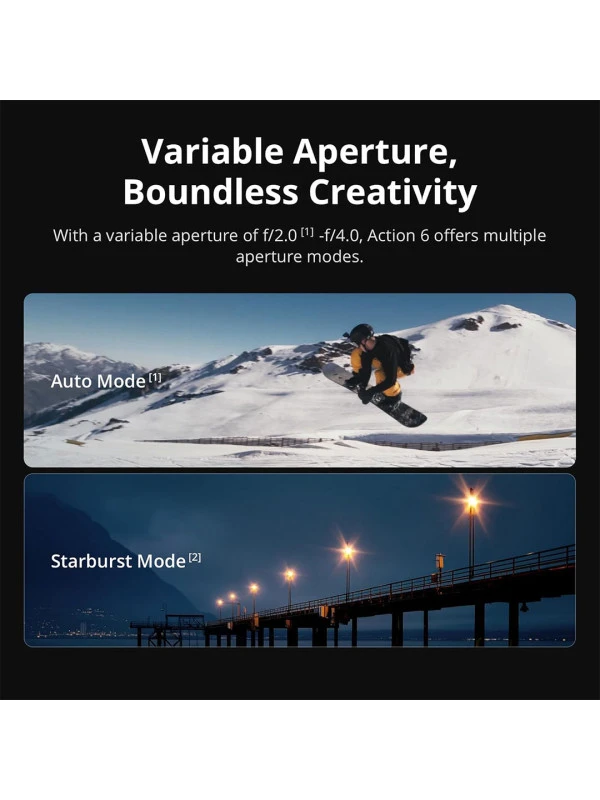 - Capture Every Scene, Day or Night - Variable aperture f/2.0 [1]–f/4.0 adapts for crystal-clear 4K footage in any light. Great for dynamic vlogs, sports, and creative shots with your action camera.