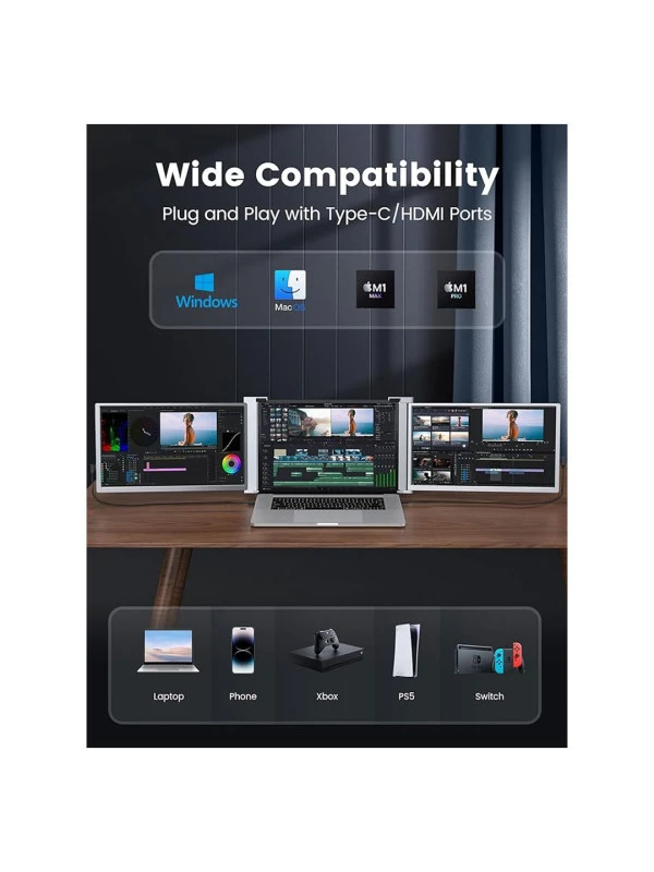 - Universal Compatibility: This dual monitor offers broad compatibility, allowing it to work with a range of devices including Windows, macOS (only for M1 Pro and M1 Max), Android, Switch, and Xbox, among others. Effortlessly connect the dual monitor extender to your preferred device and enjoy an extended display with ease. Experience the versatility and flexibility of connecting to various platforms and devices. (Note: Please ensure compatibility and check laptop size before making a purchase.)