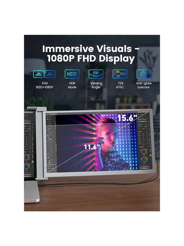 - Stunning Visuals: Elevate your productivity with the largest 15.6" laptop monitor extender. Experience ultimate multitasking and vibrant visuals with dual screens. Designed for 15.6-17.3" laptops, it expands screen real estate for optimized efficiency. Enjoy crisp FHD 1080P and 72% NTSC display, vivid colors, and wide viewing angles. Perfect for professionals, students, and anyone seeking enhanced productivity and immersive visuals.