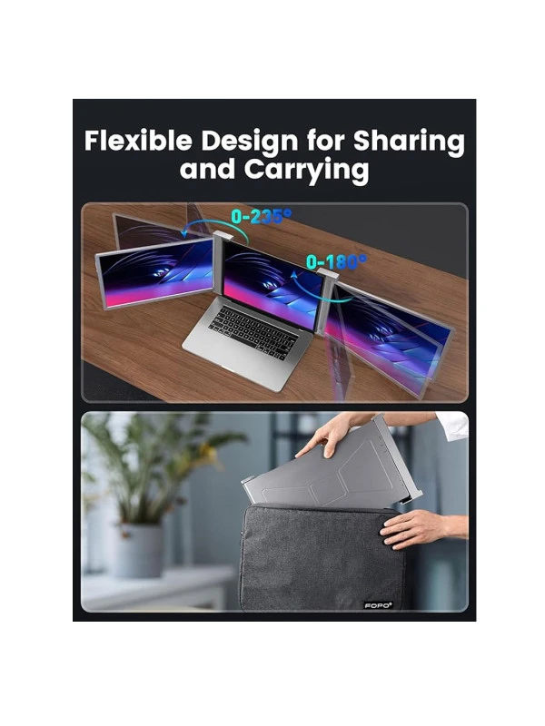 - Versatile and Portable: The FOPO triple monitor for laptop offers dual rotatable screens, giving you flexible viewing options. The right screen can rotate from 0 to 180°, while the left screen offers a rotation range of 0 to 235°. Adjust the angle to suit your needs, making it ideal for screen sharing. The portable monitor for laptop comes with a convenient carry bag, and its foldable and lightweight design makes it perfect for business trips, remote work, presentations, and more.