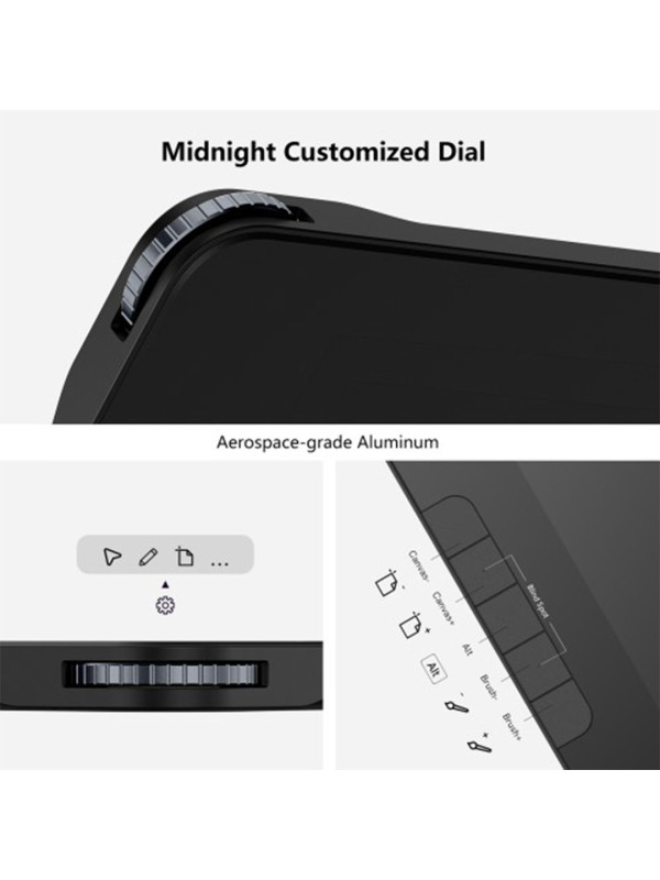 Customized Midnight Aluminum Dial and Shortcuts: Crafted from aerospace-grade aluminum with a sleek anodized finish, this midnight color dial excels in productivity, durability, and elegance. Rotate the dial and use the 5 customizable shortcut keys for quick adjustments in brush dynamics , image navigation, and so on.