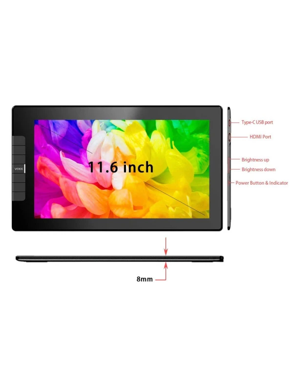 - VK1200 pen display adopts full screen design, it is all screen infinity display, almost no frame. With the same active area of 11.6 inch, VK1200 is more compact, stylish and easy to carry on the go. VK1200 graphic display is All-Metal Body, the back adopts anti-slip design to provide better drawing experience.