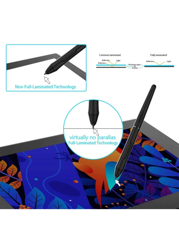 - VEIKK VK1200 drawing tablet with screen chooses full laminated screen which combining the glass and screen seamlessly. This ensures the accuracy of the cursor position and the lowest parallax. VK1200's active area is 11.6 inch with anti-glare film, it can protect the screen from scratches and offer a real paper-like drawing experience.1920x1080 IPS drawing monitor with 72% NTSC.