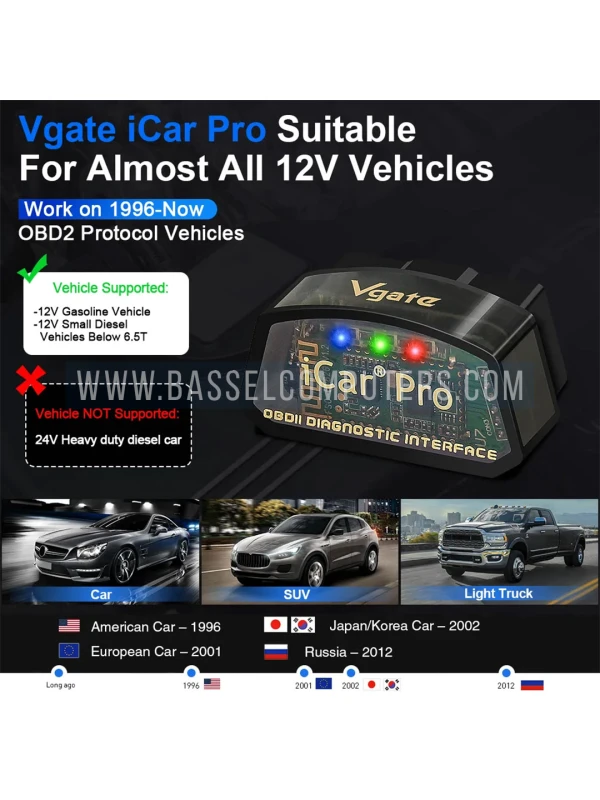 Wide coverage of vehicles: Vgate iCar Pro ELM327 is a high-quality OBD2 scanner for motor vehicles. Supports all OBD-II protocols: KWP2000, ISO9141, J1850 VPW, J1850 PWM and CAN. Works on OBD2 12 V vehicles (from 1996 in the USA) and EOBD vehicles (petrol vehicles (12 V) from 2001 and diesel vehicles (12 V) from 2003/2004).
